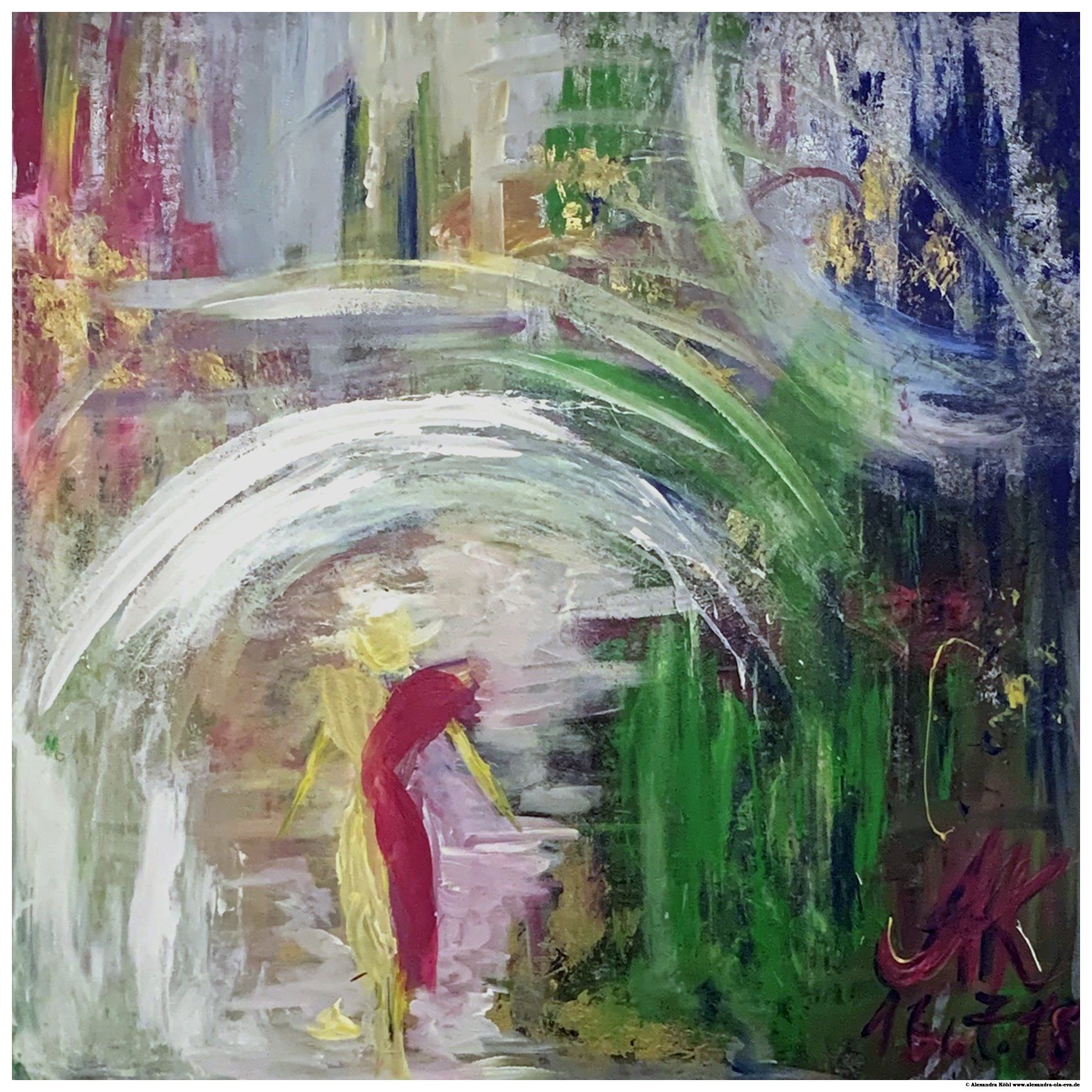 Nevertheless, this work introduces an unusual detail for the artist: the figurative element. By interpreting the concept chosen for this exhibition, Alexandra introduces the theme of motherhood placing two figures in the middle of the composition and making them the focus of the painting. Tight in an embrace that reminds a dance, they are protected by something like a domed ceiling, whose form reminds a house or, extending etaphorically its meaning, that kind of protection and safety that only motherly love can give. The artist reproduces her inner sensations through a technique full of vibrant and energetic brushstrokes, that reminds the painting movement of Action Painting. Just like the artists of the New York School, Alexandra translates the creative strength expressed by her hand on the canvas into an image. The magical atmosphere typical of her paintings, which pervades even Picture number 4, derives exactly from this unusual and instinctive creative method. When the artist starts painting, she doesn’t know in advance the result of her composition to the point of being astonished once finished. Alexandra’s style reveals her ability to perfectly combine abstractionism, which reveals itself in the choice of tones, that create an elegant visual experience, and action painting, evident in the use of an emotional and instinctive gesture.